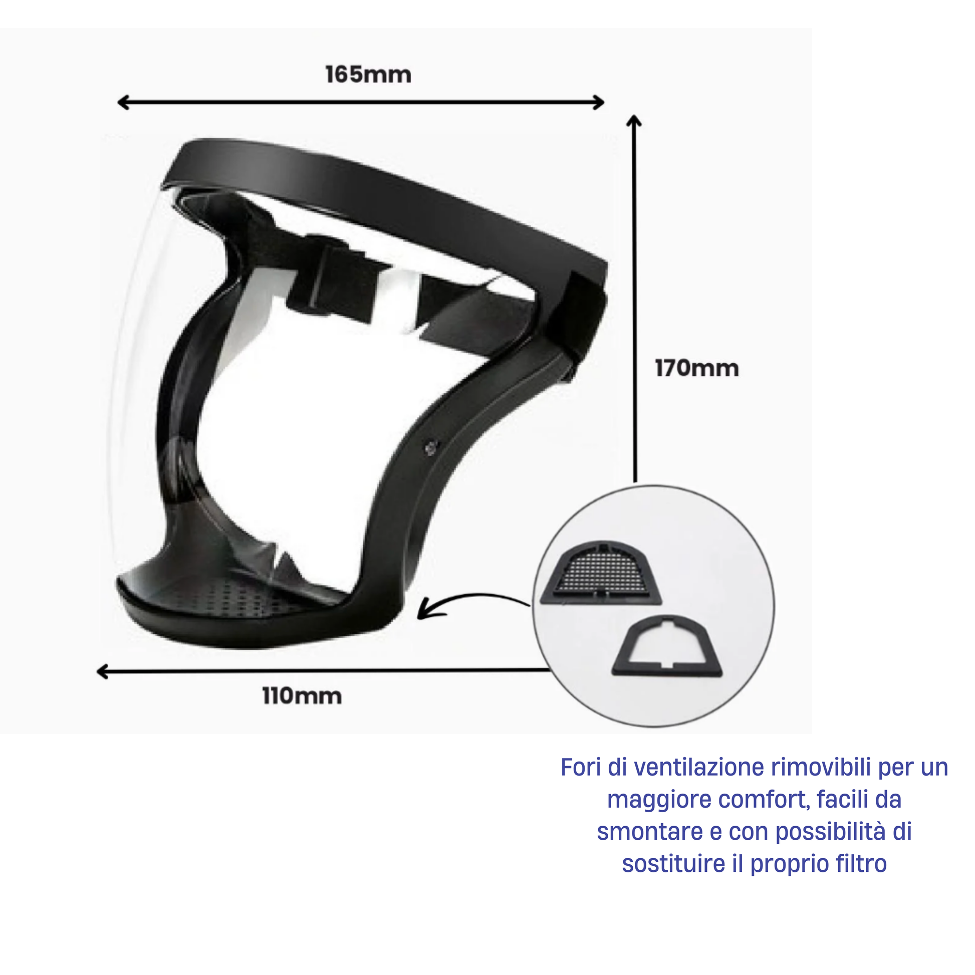 L'area sotto il mento presenta una sezione ventilata con filtro sostituibile (con tessuto o cotone). Per la massima efficienza e sicurezza igienica, il filtro deve essere sostituito quotidianamente o dopo ogni uso intensivo.
